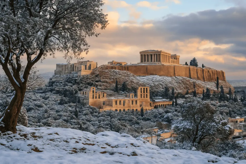 La neige est extrêmement rare en centre-ville, mais les montagnes environnantes offrent parfois des paysages blancs spectaculaires visibles depuis Athènes.